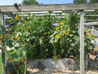 Next season I will NOT put sunflowers in the holes of the cinder block garden. They were so BIG and got in the way. I thought they were a dwarf variety—maybe so, but for my space and ease, not a good idea—but they were gorgeous.