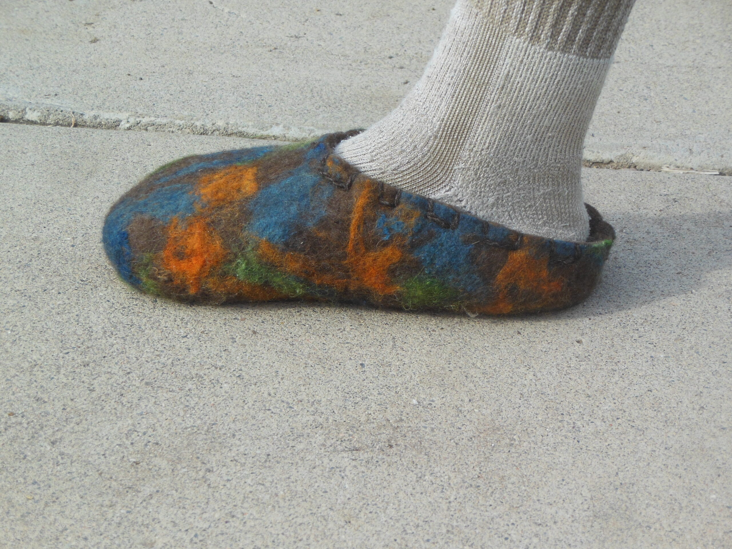 I tried on my slippers and they fit perfectly! My toes have plenty of room, they don’t hit the front, and the opening fits nicely around my ankles, not too big. It’s as if you custom-made them for my feet. The extra inserts are a plus. They fit inside very nicely and make the slippers extra luxurious. I like the color and wanted to send my thanks along to Stella for generously providing her wool; please give her an extra hug and kiss from me. Thanks for all your work on these; the craftsmanship shows through. Diane